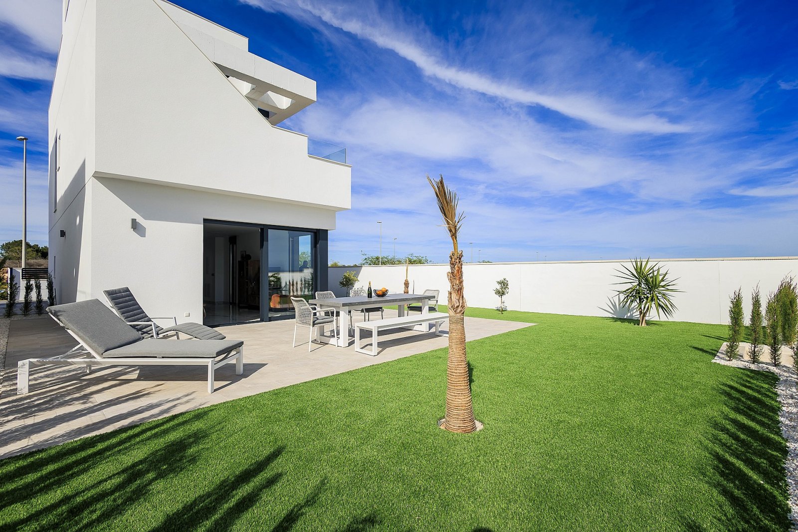 Diese stilvolle Villa verfügt über 3 Schlafzimmer und 3 Badezimmer sowie einen eigenen Parkplatz. Großzügige Innen- und Außenbereiche sorgen für ein komfortables Wohngefühl – mit Grundstücksgrößen zwischen 203 m² und 365 m² ist ausreichend Platz zum Leben und Genießen vorhanden. Ein besonderes Highlight ist das große Solarium, das einen beeindruckenden Blick auf den Golfplatz Lo Romero und die umliegende Naturlandschaft bietet.